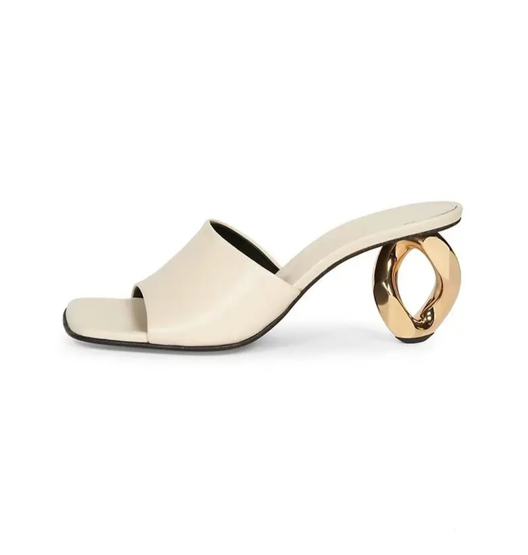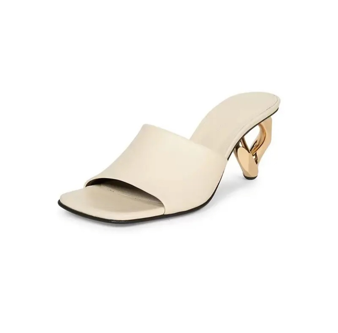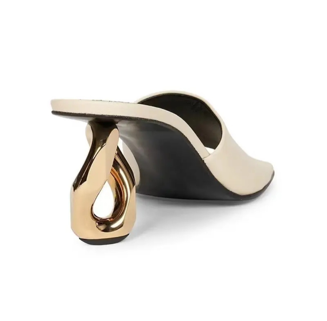 Meet your new statement sandal: these sculptural-heeled mules combine a sleek, ivory leather-look upper with an artfully twisted, gold-tone metal heel. An open square toe and minimalist slingback strap make them endlessly versatile, while a lightly cushioned insole ensures all-day comfort.