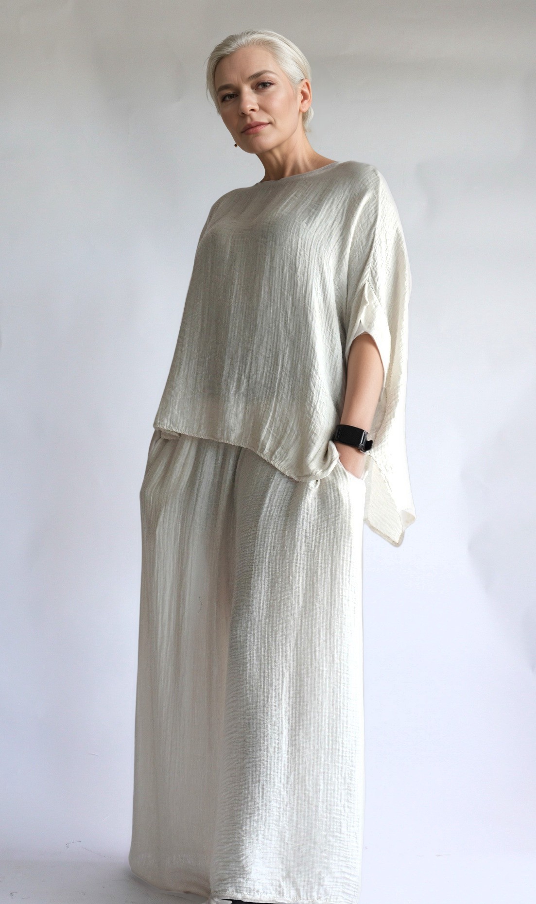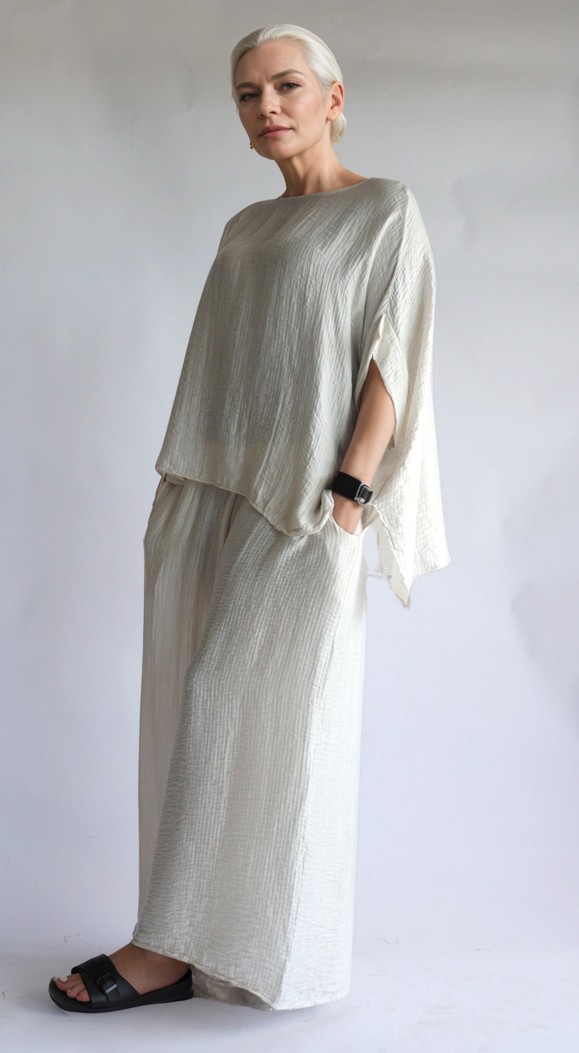 A harmonious two-piece set featuring a breezy, drapey top and wide-leg pants in a subtly crinkled satin-like fabric. The top’s relaxed, boat-neck silhouette with slit sleeves floats over the elastic-waist pants for an effortlessly elegant look that transitions from leisurely mornings to evening soirees.