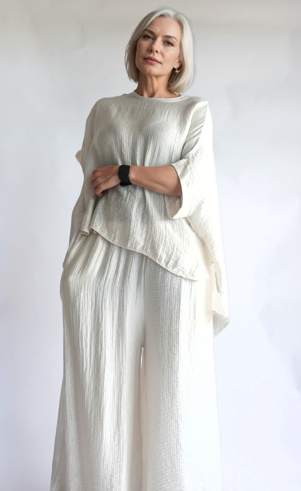 This crinkle luxe two-piece ensemble offers a relaxed yet refined silhouette, marrying sculptural texture with easy elegance. A go-to for elevated comfort from desk-to-dinner or weekend wander
