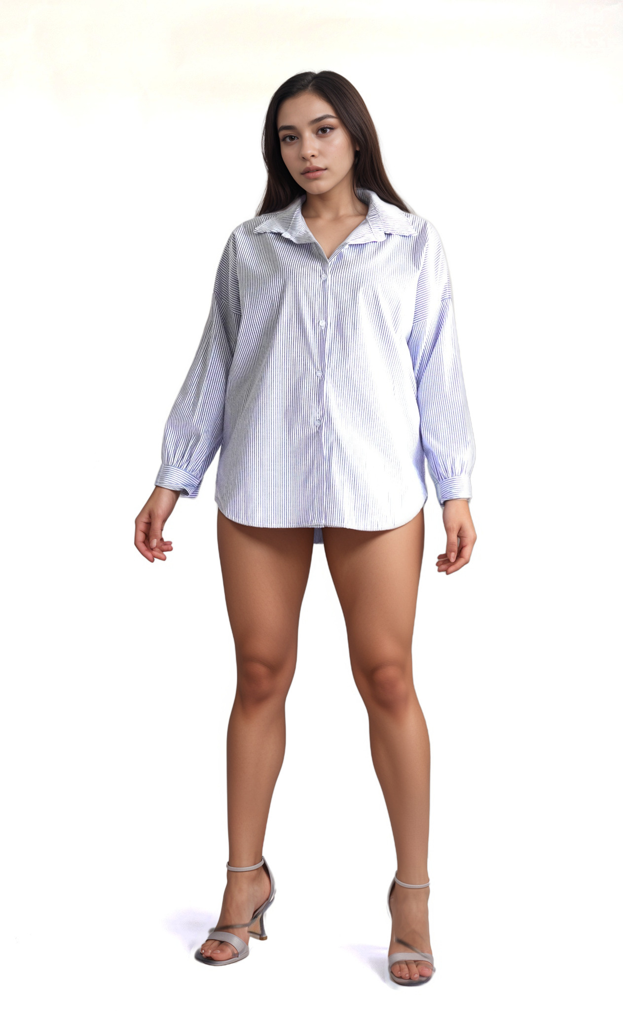 Effortlessly cool and endlessly versatile, this oversized tunic shirt features a micro-navy pinstripe on crisp white poplin. The relaxed drop-shoulder silhouette drapes away from the body, while the gently curved hem—with subtle side snaps—lets you adjust the front length for a more tailored or undone look. Long sleeves gather into neat button-cuff blouses, and the soft, semi-spread collar frames the face perfectly whether you button it up or leave it open over a camisole. Wear it solo as a chic tunic with sleek slides, or layer it over slim leggings or tailored shorts for an easy, modern update to your everyday wardrobe.